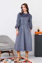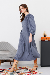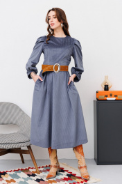 Эффектное платье длиной миди, отрезное по линии талии.По переду нагрудные вытачки переведены в талиевые. Лиф спинки со средним швом, талиевыми и плечевыми вытачками. Юбка со складками на линии талии, расширена к низу. В среднем шве спинки застежка на потайную молнию. Горловина обработана обтачкой. Рукава широкие, втачные,одношовные. По окату рукава заложены мягкие складки. Нижний срез рукава со сборкой. Карманы в боковых швах. В комплект к платью ремень не идёт.