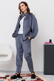 Костюм двухпредметный: состоит из джемпера и брюк. Джемпер объема оверсайз прямого силуэта. По полочке и спинке вертикальные рельефы. Рукав длинный, широкий, покроя реглан. Воротник-стойка. Застежка центральная на молнию. По низу изделия протянут эластичный шнур с фиксатором. Брюки средней посадки заужены к низу. Пояс притачной на резинке. В петли на поясе вставлен шнур. Передние половинки брюк с вертикальными швами. В боковых швах выполнены наклонные карманы.