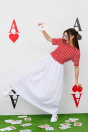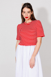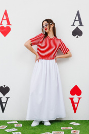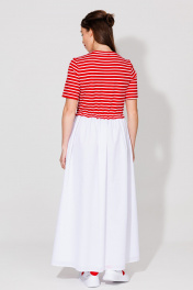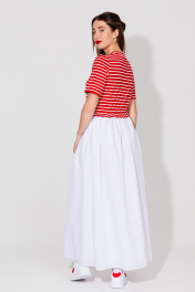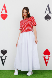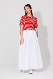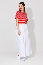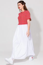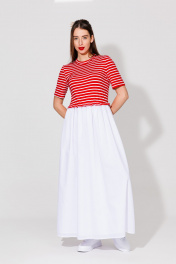 Платье макси комбинированное свободного силуэта с подрезом выше уровня талии. Спинка лифа цельная. Рукав втачной короткий. Нижняя часть платья со сборкой по верхнему шву. Горловина обработана обтачкой.