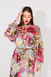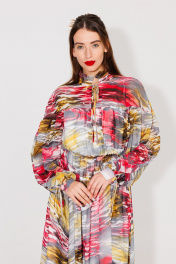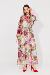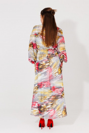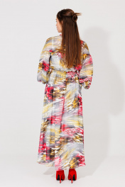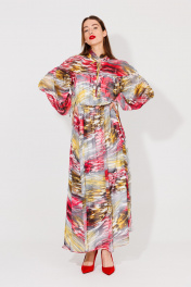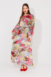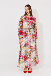 Воздушное платье макси свободного кроя состоитиз двух частей: основного платья и платья-комбинации. Полочка и спинка основного платья с отрезными кокетками, переходящими на верхнюю часть рукава. Кокетка полочки с разрезом и завязками у горловины. Горловина оформлена воротником-стойкой, верхний край украшен рюшей. По шву притачивания кокетка к полочке, спинке и рукавам выполнена сборка. Рукав длинный, одношовный. Нижний край рукавов оформлен манжетами с завязками. По линии талии резинка.