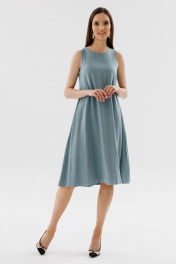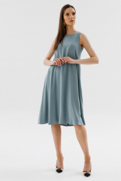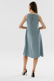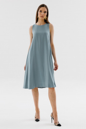Платье трапецевидного силуэта без рукавов длиной миди. Вырез горловины круглой формы. Спинка со средним швом. Застежка в среднем шве спинки на пуговицу и петлю.