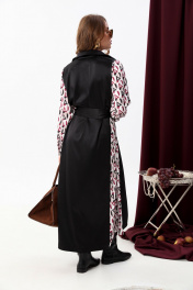 Классическое платье-рубашка прямого кроя в пол. Воротник отложной на стойке. Линия плеча немного приспущена. По груди расположены клапаны. Застёжка центральная на петли и пуговицы. Объёмный рукав с манжетой. Фигурные боковые вставки и рукава из отделочной ткани. Пояс из основной ткани входит в комплект.