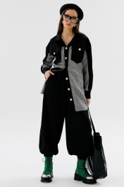 Костюм двухпредметный: состоит из рубашки и брюк. Рубашка прямого кроя со спущенной линией плеча. Горловина обработана рубашечным воротником с отрезной стойкой. Застёжка центральная на петли и пуговицы. Есть нагрудные карманы и в боковых швах. Низ рукава обработан притачной манжетой, застёгивается на петли и пуговицы. Фигурный низ. Изделие без подкладки. Брюки свободного покроя, немного зауженные к низу. Вытачка по низу передней половинки располагается по центру детали и заканчивается на уровне линии колена. Задние половинки брюк с двумя фигурными рельефами. Верхний рельеф начинается из бокового шва и заканчивается по центру низа задней половинки. Нижний рельеф начинается из бокового шва на уровне линии колена и заканчивается выше уровня линии низа в первом рельефе.По нижнему срезу брюк цельнокроеная манжета, собрана на эластичную тесьму. На передних и задних половинках пояс цельнокроеный, собран на эластичную тесьму.