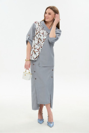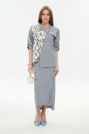 Жакет рубашечного типа прямого силуэта с асимметричным низом. Рукав втачной со спущенной линией плеча, фиксируется на пату. Застежка центральная на петли и пуговицы, смещённая по косой. Воротник отложной на стойке до половины спинки.