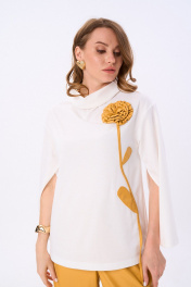 Костюм двухпредметный: состоит из джемпера и брюк. Джемпер-кейп прямого свободного силуэта. Горловина с цельнокроеным воротником-стойкой. Рукав втачной широкий, от линии локтя до запястья есть дополнительное отверстие для рук. Декорирован цветком из контрастной ткани. Брюки свободного кроя, верхний срез представлен широкой резинкой, с карманами.