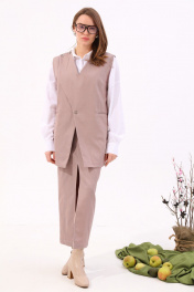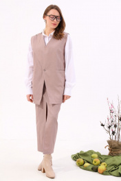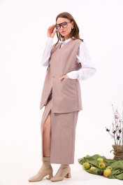 Костюм двухпредметный: состоит из жилета и юбки. Жилет прямого силуэта оверсайз. По переду талиевая вытачка переходящая в прорезной карман с клапаном и двумя обтачками. Спинка цельнокроенная. Перед фигурный симметричный с застежкой на правом плече на петли и пуговицы. Для дополнительной фиксации по центру застежка на одну петлю и пуговицу. Юбка прилегающего силуэта, зауженная к низу, длиной ниже колена с высоким разрезом по центру и застежкой на тесьму- молнию. Переднее полотнище юбки с рельефами, наклонно к которым расположены карманы. Пояс с застежкой на потайную пуговицу и крючек.