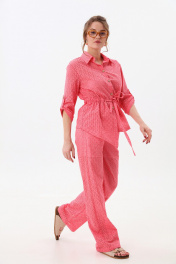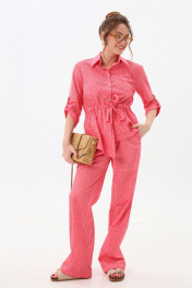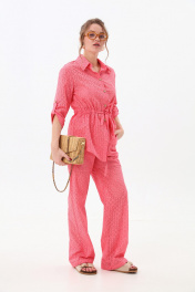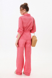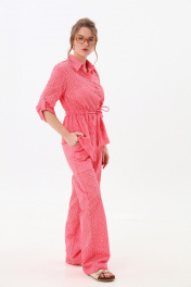Костюм двухпредметный: состоит из жакета и брюк.Жакет прямого силуэта, воротник пиджачного типа, рукав одношовный, втачной с незначительно спущенной линией плеча, длиной три четверти, с патой. По линии ткани настрачная кулиса с завязками из основной ткани. Застежка центрально-бортовая. Линия низа верхней части фигурная ассиметричная. Брюки свободного кроя, верхний срез представлен широкой резинкой, с карманами.