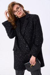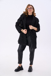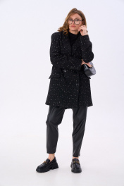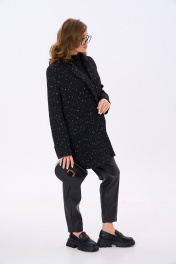 Костюм двухпредметный: состоит из жакета и брюк. Жакет оверсайз прямого силуэта на подкладке. Застежка бортовая на петли и пуговицы. Детали переда с двумя вытачками и с карманами. Карман прорезной с обтачками и клапаном. Карман с наклонным входом, прорезной, с листочкой. Спинка со средним швом. В среднем шве спинки шлица. Рукав втачной, длинный, двухшовный, с открытой шлицей в локтевом шве. Воротник английский с отрезной стойкой. Брюки с притачным поясом и с карманами в боковых швах..
