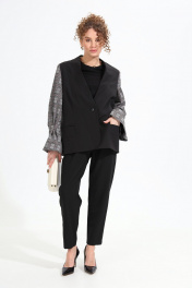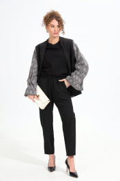 Костюм двухпредметный: состоит из жакета и брюк. Жакет комбинированный оверсайз прямого силуэта. Застежка центральная на петлю и пуговицу. В изделии спроектирована имитация лацканов и воротника с отрезной стойкой. Боковой шов отсутствует. Перед с прорезными карманами. Спинка со средним швом. Рукав втачной двухшовный, с открытой шлицей в локтевом шве. В нижней части рукава расположены складки-защипы. Брюки с притачным поясом и с карманами в боковых швах..