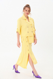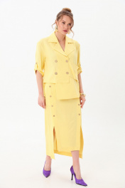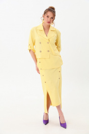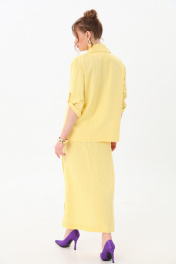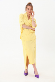 Юбка длиной миди, расклешенная к низу, с асимметричным низом. Пояс притачной, по спинке собран на резинку. Переднее полотнище состоит из трех частей. Правая часть скреплена отделочной строчкой и кнопками. В боковых швах изделия расположены карманы. По спинке изделия идёт средний шов и две вытачки для удачной посадки по фигуре. Юбка без подкладки.