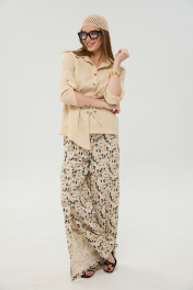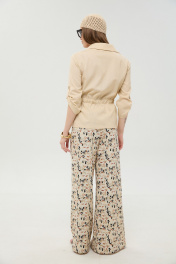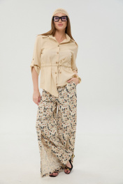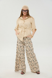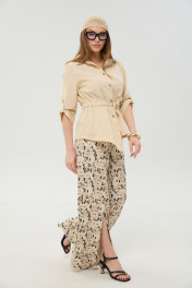 Брюки свободного кроя, верхний срез представлен широкой резинкой, с карманами. По центру правой брючины расположена планка с функционирующими петлями и пуговицами.