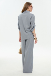 Костюм двухпредметный: состоит из жакета и брюк. Жакет рубашечного типа прямого силуэта с асимметричным низом. Рукав втачной со спущенной линией плеча, фиксируется на пату. Застежка центральная на петли и пуговицы, смещённая по косой. Воротник отложной на стойке до половины спинки. Брюки свободного кроя, верхний срез представлен широкой резинкой, с карманами. По центру правой брючины расположена планка с функционирующими петлями и пуговицами.