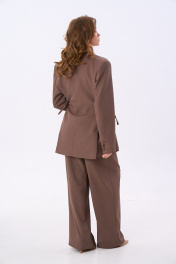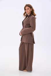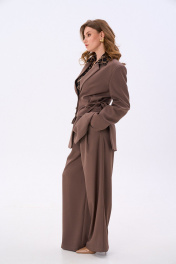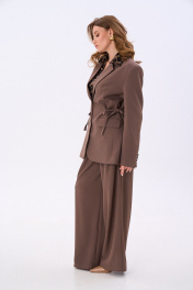 Костюм двухпредметный: состоит из жакета и брюк. Жакет свободного прилегания прямого силуэта с застежкой на прорезные петлю и пуговицу. Жакет с отрезным бочком и увеличенной линией плеча. Перед с талиевыми вытачками с прорезными карманами в рамку с клапанами. Край борта с округлением. Спинка со средним швом. В рельефных швах спинки выполнена шлица. Воротник стояче-отложной с отрезной стойкой с лацканами. Рукав втачной двухшовный длинный. В нижнем шве рукава выполнена шлица с застежкой на прорезные петли и пуговицы. Жакет на притачной подкладке. Изделие с декоративным элементом в виде завязок по бокам. Элегантные брюки прямого кроя с боковыми карманами с отрезным бочком. Застежка на молнию и пуговицу. По переду - складки. Задние половинки с талиевыми вытачками и прорезными карманами с листочкой. Верхний срез обработан притачным поясом, по спинке собран на резинку. Низ обработан швом в подгибку.