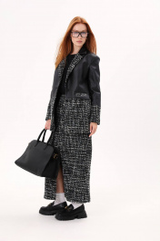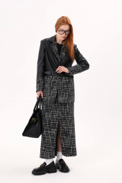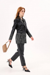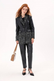Жакет однобортный из комбинированной ткани: шанель и экокожа. Изделие полуприлегающего силуэта, длиной ниже линии бедер. Рукав втачной, двухшовный. Воротник английский. На переде прорезные карманы в рамку с клапаном. Застежка центральная на петли и пуговицы. В среднем шве спинки шлица.