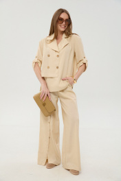 Брюки свободного кроя, верхний срез представлен широкой резинкой, с карманами. По центру правой брючины расположена планка с функционирующими петлями и пуговицами.