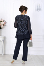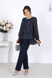 6080 Комплект брючный Этот нарядный костюм для полных женщин станет вашим универсальным решением — он уместен и на праздничном вечере, и в офисной обстановке. Модель гармонично сочетает в себе торжественность и лаконичность, поэтому одинаково эффектно смотрится как с лодочками и клатчем, так и с более сдержанными аксессуарами. Блузка прямого силуэта выполнена в двух слоях: верхний — из роскошного гипюра с утончённым растительным узором и фестонами по краю, нижний — из струящегося шифона. Такое сочетание придаёт образу глубину и воздушность, мягко скрывая возможные особенности фигуры. Длинные рукава с манжетами и завязками добавляют изысканности, а округлый вырез горловины подчёркивает линию шеи. Благодаря потайной застёжке по спинке изделие сохраняет идеальную посадку и комфорт в движении. Брюки классического кроя выполнены из качественной костюмно-плательной ткани. Они идеально садятся на талию, вытягивают силуэт и визуально стройнят фигуру. Стрелки формируют чёткие линии, придавая образу деловую собранность, а эластичная вставка на поясе обеспечивает удобство даже при длительном ношении. Комплект брючный 2-х предметный, состоящий из блузки и брюк. Блузка прямого силуэта, комбинированная. Модель двухслойная: верхний слой выполнен из гипюра с фестонами, нижний – из шифона. На верхней детали переда обработаны нагрудные вытачки, на верхней детали спинки – талиевые. В среднем шве спинки предусмотрена застежка на потайную тесьму-«молнию» (50см). Вырез горловины переда и спинки округлый, углубленный спереди. Рукав длинный, втачной, со сборкой по низу и притачной манжетой с завязками. Длина блузки – 74 см, длина рукава (с манжетой) – 59 см. Брюки классические, длинные, с посадкой на талии, выполнены из костюмно- плательной ткани. Модель со стрелками. Передние и задние половинки брюк с талиевыми вытачками, направленными от пояса вниз. Спереди обработаны наклонные боковые карманы и центральная застёжка на тесьму-«молнию». Притачной пояс застегивается на 1 петлю и 1 пуговицу; для лучшего прилегания по линии талии в притачном поясе предусмотрена эластичная лента, вставленная по спинке. Длина брюк по боковому (с поясом) – 104 см (50 – 52 р-р), 105 см (54 – 58 р-р).