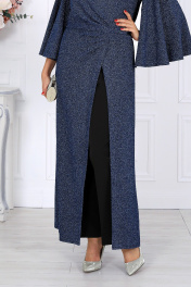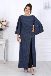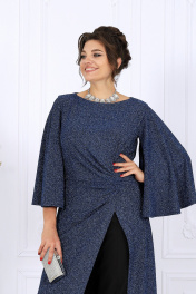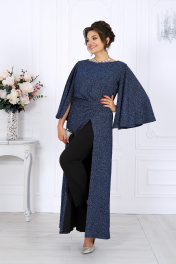 6084 Комплект брючный Этот элегантный костюм-двойка создан для женщин, которые ценят комфорт и изысканность в равной мере. Он словно приглашает сиять — мягкий блеск люрекса переливается в свете вечерних огней, создавая атмосферу праздника даже в обычный день. Туника свободно струится по фигуре, легко скрывая всё лишнее и подчеркивая достоинства. Драпировка по линии талии формирует красивый силуэт «песочных часов», а асимметричный запах добавляет образу динамики и утончённости. Эффектные рукава придают наряду торжественность, сохраняя при этом абсолютную лёгкость движений. Каждая деталь продумана до мелочей — от мягкой подкладки, обеспечивающей комфорт, до аккуратной потайной застёжки, сохраняющей чистоту линий. Этот наряд универсален: он уместен на праздничном приёме, корпоративе или ужине в ресторане, а также станет идеальным выбором для торжественных семейных событий. В нём комфортно, уверенно и красиво — именно так выглядит настоящая женственность в современном прочтении. Комплект брючный 2-х предметный, состоящий из туники и брюк. Туника полуприлегающего силуэта с расширением к низу, выполнена из трикотажного полотна с фактурной лицевой стороной «люрекс». Модель отрезная по линии талии; верхняя часть переда и спинки (лиф) на трикотажной подкладке. Лиф переда с одним рельефным швом, направленным от левой проймы; нижняя часть переда состоит из двух деталей, скрепленных на запах. По линии талии, вдоль рельефа, перед задрапирован сборкой и односторонними складками. На спинке обработаны талиевые вытачки и средний шов с застежкой на потайную тесьму-«молнию» (50 см). Вырез горловины спинки и переда формы «лодочка». Рукав без шва, с отлетными краями; крепится к пройме только в верхней части. Длина туники – 139 см; длина рукава – 51 см. Брюки классические, длинные, с посадкой на талии, выполнены из костюмно- плательной ткани. Модель со стрелками. Передние и задние половинки брюк с талиевыми вытачками, направленными от пояса вниз. Спереди обработаны наклонные боковые карманы и центральная застёжка на тесьму-«молнию». Притачной пояс застегивается на 1 петлю и 1 пуговицу; для лучшего прилегания по линии талии в притачном поясе предусмотрена эластичная лента, вставленная по спинке. Длина брюк (с поясом) – 102 см (50-52р-р); длина брюк (с поясом) – 103 см (54-58р-р).