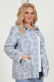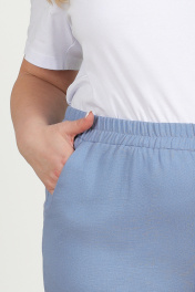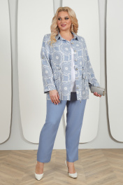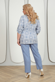 7424 Комплект брючный Этот женский костюм — идеальный выбор для летних дней, выполнен из льняной ткани, обеспечивая комфорт и стиль. Наш костюм станет неотъемлемой частью гардероба каждой женщины, ведь он универсальный и подходит для различных ситуаций. Вы сможете носить его как в офисе, создавая деловой и стильный образ, так и на торжественных мероприятиях, подчеркивая свою элегантность и женственность. Комплект брючный 3-х предметный, состоящий из блузки, выполненной из отделочной ткани лен принт, брюк, выполненных из однотонного льна и джемпера из трикотажного полотна. Блузка прямого силуэта, с центральной бортовой застежкой с отрезными планками на 7 петель и 7 пуговиц, со стояче-отложным воротником с отрезной стойкой. Длина изделия по середине спинки 72 см от шва втачивания воротника в горловину. Перед с нагрудными вытачками, выходящими из пройм. В нижней части переда настрочены накладные карманы, с имитацией бантовой складки посередине кармана и клапаны, застегивающиеся на 1 петлю и 1 пуговицу. По спинке и частично по переду настрочена кулиса, в которую втянут шнур. Для регулировки сборки по кулисе на шнур продеты фиксаторы, концы шнура оформлены наконечниками. Рукава втачные, одношовные, с притачными манжетами, застегивающимися на 1 петлю и 1 пуговицу, с разрезами в нижних швах рукавов, с настрочными патами, застегивающимися на 1 петлю и 1 пуговицу. Длина рукава с манжетой 59,5 см. Длина рукава может регулироваться с помощью паты. Блузка с плечевыми накладками. Брюки с посадкой на талии, зауженные к низу, на притачном поясе с резинкой вдоль всего пояса, длиной по боковому шву 102 см с учетом пояса. На передних половинках брюк расположены наклонные боковые карманы. Джемпер полуприлегающего силуэта, длиной по середине спинки 63 см. Перед с нагрудными вытачками, выходящими из пройм. Из горловины вниз застрочены 4 складки. Горловина переда и спинки округлой формы, по переду углубленная. Срезы горловин окантованы косой бейкой. Рукава втачные, одношовные. Длина рукава 26 см.