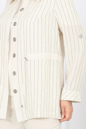 7463 Комплект брючный Брючный костюм тройка - элегантность, комфорт и белорусское качество Жакет прямого силуэта выполнен из костюмно-плательной ткани лён в полоску — смотрится статусно и визуально вытягивает силуэт. Регулируемая кулиса подчёркивает талию и позволяет настроить посадку под фигуру. Рукава с патами дают возможность менять длину, создавая более расслабленный или деловой образ. Брюки из однотонной льняной костюмной ткани с резинкой по всей линии пояса обеспечивают комфортную посадку, не сковывают движения и отлично подходят для женщин больших размеров и для полных. Джемпер из мягкого трикотажного полотна гармонично дополняет комплект — его можно носить как в составе костюма, так и отдельно. Этот костюм — удачное решение, если нужен офисный, деловой, повседневный или нарядный образ, который выглядит дорого и при этом остаётся удобным. Комплект брючный 3-х предметный, состоящий из жакета, брюк и джемпера. Жакет выполнен из костюмно-плательной ткани лён полоска, брюки выполнены из костюмно-плательной ткани лён однотон, джемпер выполненный из трикотажного полотна. Жакет прямого силуэта, с центральной бортовой застежкой с отрезными планками на 7 петель и 7 пуговиц, со стояче-отложным воротником с отрезной стойкой. Длина изделия по центру спинки 73 см от шва втачивания воротника в горловину. Перед с нагрудными вытачками, выходящими из пройм. По спинке и частично по переду настрочена кулиса, в которую втянут шнур. Для регулировки сборки по кулисе на шнур продеты фиксаторы, концы шнура оформлены наконечниками. Рукава втачные, одношовные, с притачными манжетами, застегивающимися на 1 петлю и 1 пуговицу, с разрезами в нижних швах рукавов, с настрочёнными патами, застегивающимися на 1 петлю и 1 пуговицу. Длина рукава с манжетой 62 см. Длина рукава может регулироваться с помощью паты. Жакет с плечевыми накладками. Брюки с посадкой на талии, зауженные к низу, на притачном поясе с резинкой вдоль всего пояса. На передних половинках брюк расположены наклонные боковые карманы. Джемпер прилегающего силуэта. Перед с нагрудными вытачками, выходящими из пройм. Из горловины переда вниз выходят 4 складки. Горловина переда и спинки округлой формы, по переду углубленная. Срезы горловин окантованы косой бейкой. Рукава втачные, одношовные. Длина рукава 26 см.