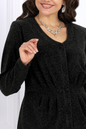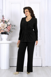 7477 Комплект брючный Элегантный брючный комплект – идеальный выбор для праздника, вечера в ресторане или важного мероприятия. Жакет с выразительным V-образным вырезом и аккуратными складками по линии талии подчёркивает женственный силуэт, а сияющая ткань с люрексом придаёт образу динамику и мягкость, создавая гармоничное сочетание классики и современности. Комплект брючный 2-х предметный, состоящий из жакета и брюк. Жакет отрезной по линии талии, выполнен из трикотажного полотна с фактурной лицевой стороной «люрекс». Модель на подкладке, с плечевыми накладками; без воротника, с V-образным вырезом горловины. В верхней части переда заложены 3 односторонние складки, направленные от талии к центру груди, и 3 односторонние складки на баске, направленные к низу. На спинке обработаны талиевые вытачки. Борта и горловина оформлены отрезной планкой. Жакет с однобортной застежкой на 5 прорезных петель и 5 пуговиц, обтянутые основным материалом. Рукав длинный, втачной. Длина жакета – 68 см; длина рукава – 61 см. Брюки классические длинные, прямого силуэта, с посадкой на талии, выполнены из трикотажного полотна с фактурной лицевой стороной «люрекс». Модель без застёжки, на притачном поясе, с эластичной лентой внутри. Передние половинки брюк с боковыми наклонными карманами. Длина брюк по боковому (с поясом) – 108 см.