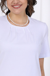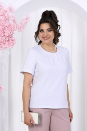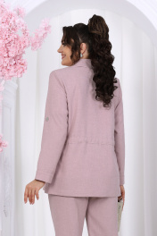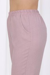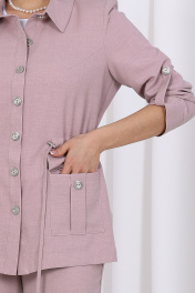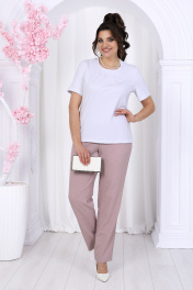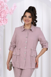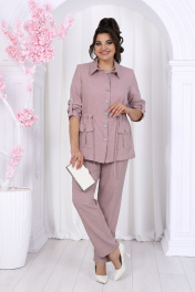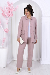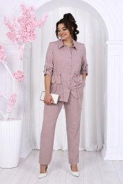 7492 Комплект брючный Этот костюм - идеальное сочетание стиля, комфорта и практичности. Он подойдет как для деловых встреч, так и для повседневного использования, дополняя ваш образ уверенностью и элегантностью. Если вам нравится изделия из натурального льна, но надоело ходить всегда в мятой одежде, то ткань лен вишер эта ваше находка. Хотя в составе ткани не присутствует лен, она прекрасно дышит и полностью повторяет текстуру натурального льна, а самое главное она практически не мнется. Комплект брючный 3-х предметный, состоящий из жакета, джемпера и брюк. Жакет прямого силуэта, выполнен из ткани «лен-вишер». Модель без подкладки, с плечевыми накладками и однобортной внешней застежкой с отрезными планками на 7 петель и 7 пуговиц. Перед с нагрудными вытачками, выходящими из пройм. В нижней части переда настрочены накладные карманы с бантовой складкой посередине кармана и клапаны, застегивающиеся на 1 петлю и 1 пуговицу. По спинке и частично по переду настрочена кулиса, в которую втянут поясок из основной ткани. Для регулировки сборки по кулисе предусмотрены фиксаторы, концы пояса оформлены наконечниками. Горловина округлой формы со стояче-отложным воротником на отрезной стойке. Рукав втачной, длинный, с притачной манжетой, застегивающейся на 1 петлю и 1 пуговицу; по середине рукава настрочена пата, застегивающаяся на 1 петлю и 1 пуговицу, что позволяет регулировать длину рукава. Длина жакета - 71 см (46-50 р-р), 72 см (52-60 р-р), 73 см (62-66 р-р). Длина рукава (с манжетой) - 61 см. Джемпер полуприлегающего силуэта, выполнен из хлопкового трикотажного полотна. Перед с нагрудными вытачками, выходящими из пройм. От горловины вниз застрочены 4 складки. Горловина переда и спинки округлой формы, по переду углубленная. Срезы горловин окантованы косой бейкой. Рукав втачной, короткий. Длина джемпера -60 см (46-50 р-р), 65 см (52-60 р-р), 67 см (62-66 р-р). Длина рукава – 24,5 см (46-50 р-р), 25,5 см (52-60 р-р), 26,5 (62-66 р-р). Брюки классические длинные, прямого силуэта, с посадкой на талии, выполнены из ткани «лен-вишер». Модель без застёжки, на притачном поясе, с эластичной лентой внутри. Передние половинки брюк с боковыми наклонными карманами. Длина брюк по боковому (с поясом)-103 см (46-54 р-р), 104,5 см (56-60 р-р), 106 см (62-66 р-р).
