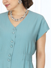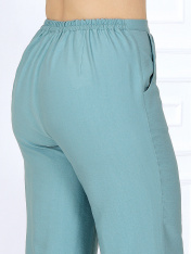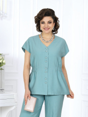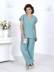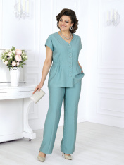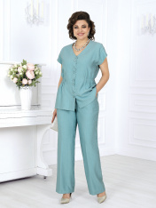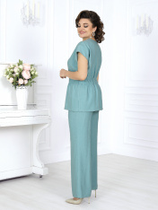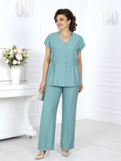 7494 Комплект брючный Брючный костюм из вискозы – элегантность, созданная для комфорта. Стильный костюм двойка, состоящий из приталенной блузки и классических брюк, — идеальное решение для делового гардероба, офисных будней и летних мероприятий. Модель выполнена из мягкого вискозного полотна, которое приятно к телу и дарит ощущение легкости и свободы движений жарким летом. Универсальный фасон — легко адаптируется под праздничный и деловой стиль, подходит для женщин с пышными формами, визуально вытягивает силуэт и делает фигуру стройнее, идеален для офиса, торжественных событий и повседневной носки. Комплект брючный 2-х предметный, состоящий из блузки и брюк. Блузка приталенного силуэта, выполнена из вискозного полотна. Модель со спущенной линией плеча, без воротника, без рукавов и плечевых накладок. По линии талии спинки и частично переда с изнанки настрочена кулиса с широкой эластичной лентой внутри. Перед с застежкой на 8 петель и 8 пуговиц, расположенных по 4 пары через равные расстояния. Горловина по спинке округлая, спереди V-образная. Квадратная пройма оформлена обтачной фигурной планкой. Длина блузки – 65 см. Брюки классические, длинные, с посадкой на талии, выполнены из вискозного полотна. Модель без стрелок. Задние половинки брюк с талиевыми вытачками, направленными от пояса вниз; на передних – по 2 односторонние складки. Спереди обработаны наклонные боковые карманы и центральная застёжка на тесьму-«молнию». Притачной пояс застегивается на 1 петлю и 1 пуговицу; для лучшего прилегания по линии талии в притачном поясе предусмотрена эластичная лента, вставленная по спинке. Длина брюк по боковому (с поясом) – 108 см.