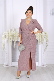 7515 Платье женское Ослепительное платье из мерцающего люрекса создано для тех, кто хочет выглядеть роскошно и уверенно на любом торжестве. Эта модель моментально притягивает взгляд — благородный блеск ткани, элегантный V-образный вырез, женственный запах и изящные складки создают по-настоящему праздничный образ, который подчёркивает фигуру и делает её зрительно стройнее. Платье продумано до мелочей, чтобы каждая женщина — в том числе в больших размерах — чувствовала себя уверенной, женственной и роскошной. Мерцающий люрекс под светом ламп и софитов смотрится особенно эффектно — идеально для свадьбы, юбилея, корпоратива, новогодней вечеринки или любого важного события, где нужно блистать. Съёмный декоративный цветок позволяет легко менять настроение образа: хочешь — создаёшь более торжественный акцент, хочешь — оставляешь чистую элегантную линию. Платье женское полуприлегающего силуэта, выполнено из трикотажного полотна с фактурной лицевой стороной «люрекс». Модель на трикотажной подкладке, с плечевыми накладками и застежкой в левом боковом шве на потайную тесьму-«молнию» (35 см). Перед отрезной по линии талии. Верхняя часть переда состоит из двух деталей, скрепленных на запах; вдоль горизонтального подреза заложены односторонние складки. На нижней части переда обработан рельефный шов с двойным воланом в верхней части и разрезом по низу; от шва к центру направлены односторонние складки. На спинке обработаны талиевые вытачки. Рукав трехчетвертной. Платье дополнено съемным «цветком» из основного полотна. Длина платья – 134 см; длина рукава – 42 см.