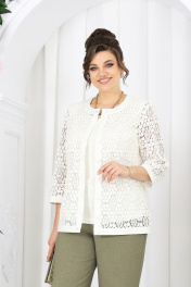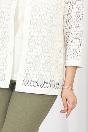 7518 Комплект брючный Брючный костюм 3 в 1 — утончённая элегантность на каждый день и особый случай. Этот костюм — как дыхание весны: светлый, воздушный, гармоничный. Он создан для женщины, которая выбирает не просто одежду, а настроение — легкое, уверенное и по-настоящему женственное. Кружевной жакет добавляет образу изысканности и глубины, словно тонкая работа мастера. Полупрозрачная фактура мягко играет на свету, подчеркивая деликатность и статус. Под ним — лаконичный джемпер из вискозного трикотажа, который дарит комфорт и ощущение уюта в течение всего дня. Брюки из ткани «лен-вишер» завершают образ — они держат форму, струятся при движении и создают тот самый эффект «дорогой простоты». Комплект брючный 3-х предметный, состоящий из жакета, джемпера и брюк. Жакет полуприлегающего силуэта, выполнен из кружева х/б. Модель без подкладки и без плечевых накладок. Перед с нагрудными вытачками, направленными от пройм вниз, и отрезной планкой по подборту и горловине. Жакет с центральной внешней застежкой на 8 петель и пуговиц (обтянутых основной тканью). Рукав 7/8, втачной с притачной замкнутой манжетой по низу. Низ жакета и горловина обработаны по низу притачной планкой из основной ткани. Длина жакета - 64 см (50-58 р-р); длина рукава – 45 см (50-58). Джемпер полуприлегающего силуэта, выполнен из вискозного трикотажного полотна. Горловина округлой формы, углубленная спереди. Срезы горловины и пройм окантованы косой бейкой. Длина джемпера –64 см. Брюки классические, с посадкой на талии, выполнены из ткани «лен-вишер». Модель без стрелок, с центральной застёжкой на тесьму-«молнию», на притачном поясе, застегивающемся на петлю и пуговицу. Задние половинки брюк с талиевыми вытачками, направленными от пояса вниз. По передним половинкам брюк застрочены складки-«защипы» по центру. Спереди обработаны боковые наклонные карманы. Для лучшего прилегания брюк в области талии в поясе по задним половинкам вставлена эластичная лента. Длина брюк по боковому (с поясом) – 107 см (50-58).