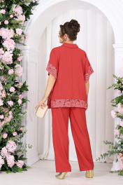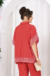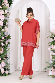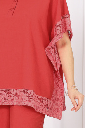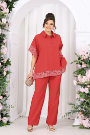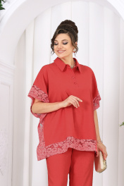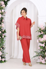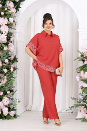 7525 Комплект брючный Легкость льна без заломов — костюм, в котором комфорт сочетается с элегантностью. Если вам нравится изделия из натурального льна, но надоело ходить всегда в мятой одежде, то ткань “лен-вишер” эта ваше находка. Хотя в составе ткани не присутствует лен, она прекрасно дышит и полностью повторяет текстуру натурального льна, а самое главное она практически не мнется. Костюм состоит из свободной блузки и классических брюк, которые создают гармоничный и универсальный образ. Такой костюм легко подойдет как для праздничных мероприятий, так и для повседневных выходов — от деловых встреч до семейных торжеств. Бренд NINELE CHIC более 20 лет создаёт женскую одежду с полным циклом производства в Беларуси, уделяя особое внимание посадке, тканям и современному дизайну. Комплект брючный 2-х предметный, состоящий из блузки и брюк. Блузка прямого силуэта, выполнена из “льна-вишера”. Рукав цельнокроенный со спущенной линией плеча, без плечевых накладок. Горловина оформлена отложным воротником на отрезной стойке. По центру полочки оформлена накладная планка до линии груди, на ней обработана застежка на 4 петли и пуговицы. По спинке есть центральный шов. Боковые, низ рукава и низ блузы обработаны отделочным кружевом. Длина блузки – 67,5 см - (50-58 р-р.); длина рукава (от горловины) – 37 см (50-58 р-р.). Брюки классические, с посадкой на талии, выполнены из “льна-вишера”. Модель без стрелок, с центральной застёжкой на тесьму-«молнию», на притачном поясе, застегивающемся на петлю и пуговицу. Задние и передние половинки брюк с талиевыми вытачками, направленными от пояса вниз. Спереди обработаны боковые наклонные карманы. Для лучшего прилегания брюк в области талии в поясе по задним половинкам вставлена эластичная лента. Длина брюк по боковому (с поясом) – 107 см - (50-58 р-р).
