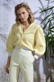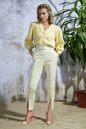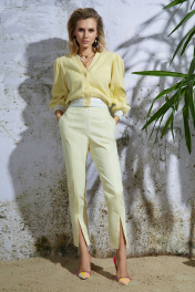 Суперстильные укороченные(до косточек) брючки-хит сезона 2022! Цвет - нежный желтый. Брюки выполнены из хлопковой ткани со стрейчем, которая прекрасно держит форму. Изделие на поясе. Застежка на декоративную молнию по центру. Спереди разрезы по центру и фигурные карманы . Сзади прорезные карманы в рамку. Брюки средней посадки великолепно садятся на любую фигуру.