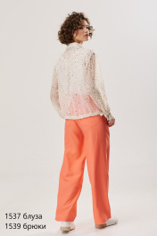 Блуза прямого силуэта. Выполнена застежка на петли и пуговицы. По горловине стояче-отложной воротник с отрезной стойкой. По спинке кокетка и склада на свободу движения. Воротник, край планки и манжета декорированы дизайнерской тесьмой.