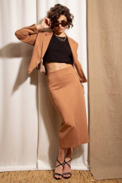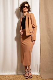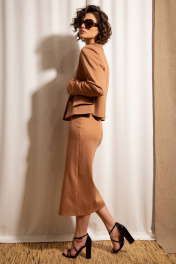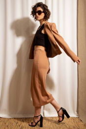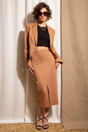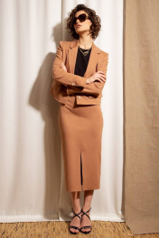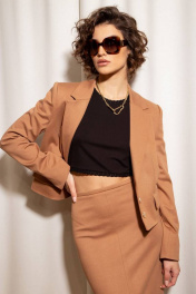 Укороченный жакет из трикотажа прямого силуэта, однобортный с застежкой на 3 пуговицы. Воротник отложной с лацканами. На переде талиево-нагрудные вытачки и карманы с клапанами. Рукава втачные, длинные с открытыми шлицами по низу с застежкой на декоративные пуговицы. Изделие на поливискозной подкладке.