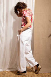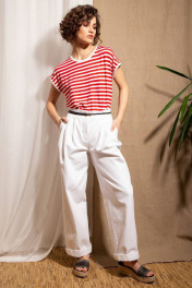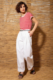 Джемпер из трикотажа в полоску прямого силуэта со спущенной линией плеч. Вырез горловины и проймы обработан контрастными окантовками.