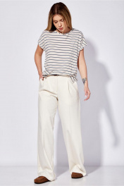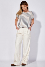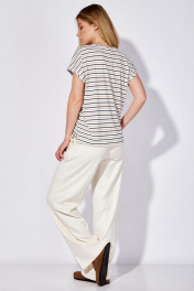 Изделие из тонкого трикотажа в полоску прямого силуэта со спущенной линией плеч. Вырез горловины и проймы обработан широкими окантовками из основной ткани.