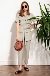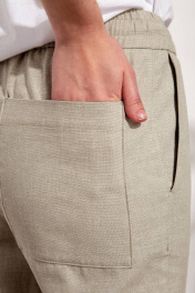 Современные брюки-джоггеры из льна, слегка зауженные к низу на притачном поясе на резинке с кулисой. В брюках обработаны боковые наклонные карманы и накладные карманы сзади.