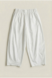 Брюки из хлопковой ткани эффекта «крэш», с объемным кроем в области бедер, зауженные к щиколотке. Передние и задние части брюк с вертикальными швами. Карманы в вертикальных швах по передних частях брюк. Брюки на резинке.