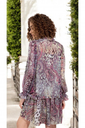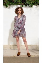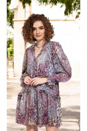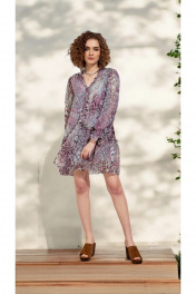Эффектное платье из полупрозрачного шифона санималистичным принтом, разведенное к низу. Вырез горловины V-образный, декорированный рюшей переходящей в средний шов. По плечам кокетки со сборкой на венгерку в несколько рядов. В области бедер фигурный подрез с декоративной рюшей. Рукава со сборкой по окату, длинные, со сборкой на венгерку в несколько рядов в нижней части рукава. В комплекте нижнее платье на тонких бретелях.