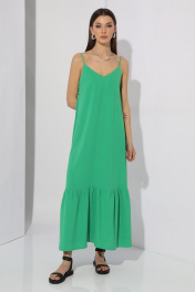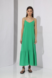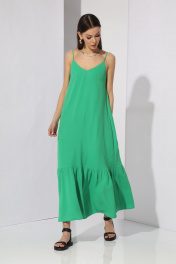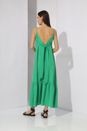 Платье женское А-образного силуэта, на бретелях, с открытой спинкой. Выполнено из ткани с содержанием вискозы, плательного ассортимента. Перед и спинка цельные, с V-образным вырезом. На переде расположены нагрудные вытачки. В боковые швы вставлен пояс. По низу платья притачен волан. Ширина изделия на уровне глубины: 42р – 42см, 44р – 44см, 46р – 46см Ширина по линии талии: 42р – 47см, 44р – 49см, 46р – 51см Ширина по линии бедер: 42р – 54см, 44р – 56см, 46р – 58см Длина по шлейке: 42р – 125см, 44р – 125см, 46р –125см