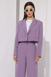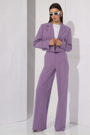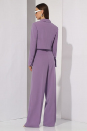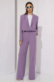 Комплект женский, состоящий из жакета и брюк. Втачного покроя с двубортной застежкой. Жакет на подкладке, укорочен. Горловина оформлена воротником пиджачного типа. Рукав двухшовный с вытачной шлицей по низу на три пуговицы. На левой детали переда расположена листочка. Линия плеча расширена. На переде расположены нагрудные вытачки, идущие от низа изделия. Спинка со средним швом и талевыми вытачками. Брюки прямые, к низу расширенны. Верхний срез брюк обработан поясом со шлевками. В боковых швах расположены наклонные карманы. На задних половинках расположены талевые вытачки. В комплект входит пояс из основной ткани. Жакет: Ширина изделия на уровне глубины: 42р – 45см, 44р – 47см, 46р – 49см Ширина по линии талии: 42р – 42см, 44р – 44см, 46р – 46см Длина по среднему шву спинки: 42р – 42см, 44р – 42см, 46р – 42см Ширина спинки: 42р – 36,5см, 44р – 36,5см, 46р – 36,5см Ширина плеча: 42р – 13,5см, 44р – 13,5см, 46р – 13,5см Ширина рукава под проймой: 42р – 16,5см, 44р – 17,5см, 46р – 18,5см Длина рукава: 42р – 62см, 44р – 62см, 46р – 62см Длина ремня (пояса): 105см Ширина ремня (пояса): 5см Брюки: Ширина по линии талии: 42р – 34см, 44р – 36см, 46р – 38см Ширина по линии бедер: 42р – 47см, 44р – 49см, 46р – 51см Длина по боковому шву: 42р – 108см, 44р – 108см, 46р – 108см Ширина брючины внизу: 42р – 30см, 44р – 31см, 46р – 32см Высота посадки: 42р – 35см, 44р – 35см, 46р – 35см Длина по внутреннему шву: 42р – 82см, 44р – 82см, 46р – 82см