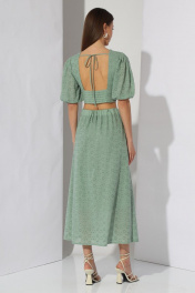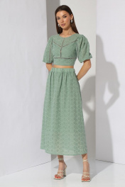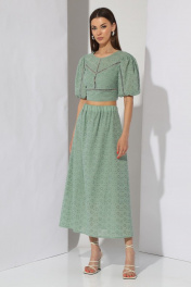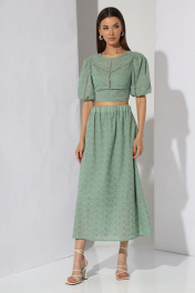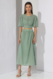 Комплект женский 2-х предметный, состоящий из блузы-топа и юбки. Комплект выполнен из хлопковой ткани с вышивкой "ришелье" и однотона. Блуза втачного покроя, плечевой пояс заужен, рукава по окату со встречными складками и резинкой по низу, длина рукава до локтя. Перед блузы резной, состоит из кокеток, центральной части и нижней части, которые соединены кружевной тесьмой. В рукава также вставлена тесьма. По переду горловина округлой формы, центральная часть спинки открыта. Спинка состоит из боковых нижних частей и центральной нижней части. Горловина по спинке в виде прямоугольника. В центральной нижней части вставлена резинка. В верхней части спинка завязывается тесьмой. В боковом левом шве расположена тесьма "молния". Юбка на подкладке, длина "миди". Верхний срез обработан поясом из однотона на резинке. Юбка расширена к низу. Блуза: Ширина изделия на уровне глубины: 42р – 42см, 44р – 44см, 46р – 46см Ширина по линии талии: 42р – 35см, 44р – 37см, 46р – 39см Длина по среднему шву спинки: 38см Ширина плеча: 8см Ширина рукава под проймой: 42р – 23см, 44р – 24см, 46р – 25см Длина рукава: 36см Юбка: Ширина по линии талии (без натяжения резинки): 42р – 30см, 44р – 32см, 46р – 34см Ширина по линии бедер: 42р – 60см, 44р – 62см, 46р – 64см Длина по боковому шву с поясом: 89см