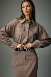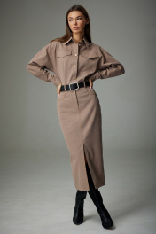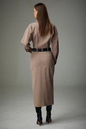 Платье выполнено из джинсовой ткани, полуприлегающего силуэта, покроя спущенное плечо, длинной за колено, зауженное к низу. Рукав длинный двушовный с манжетой по низу. Данное платье создает эффект блузы заправленной в юбку по талии. По переду и на спинке расположена горизонтальная кокетка, по спинке средний шов. По переду в шов притачивания кокетки вставлены клапаны. Горловина оформлена стояче-отложным воротником с отрезной стойкой. В верхней части переда расположена застежка-планка на пуговицы. В области талии по спинке и по переду расположен пояс-кокетка со шлевками. Нижняя часть платья оформлена как юбка – с разрезом по переду, с закругленными джинсовыми карманами в области бедер и застежкой на гульфик. Ремень не входит в комплект Платье: Ширина изделия на уровне глубины: 42р – 49см, 44р – 51см, 46р – 53см, 48р – 55см, 50р – 57см, 52р – 59см. Ширина по линии талии: 42р – 33см, 44р – 35см, 46р – 37см, 48р – 40см, 50р – 42см, 52р – 44см. Ширина по линии бедер: 42р – 46,5см, 44р – 48,5см, 46р – 50,5см, 48р – 52,5см, 50р – 54,5см, 52р – 56,5см. Длина по среднему шву спинки: 42р – 135см, 44р – 135см, 46р – 135см, 48р – 136см, 50р – 136см, 52р – 136см. Ширина плеча: 42р – 21,5см 44р – 21,5см, 46р – 21,5см., 48р – 23см, 50р – 23см, 52р – 23см. Ширина рукава под проймой: 42р – 22см, 44р – 22см, 46р – 22см., 48р – 24см, 50р – 24см, 52р – 24см. Длина рукава: 42р – 53см, 44р – 53см, 46р – 53см, 48р – 53см, 50р – 53см, 52р – 53см.