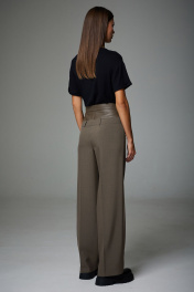 Комплект, состоящий из жакета и брюк, втачного покроя, свободного силуэта. Выполнен из двух видов ткани. Жакет прямого силуэта, на подкладке. Воротник пиджачного типа. Центрально-бортовая застежка на две пуговицы. Рукав двухшовный. Спинка со средним швом, карманы функциональные, прорезные в рамку с клапаном. Борта слегка закруглены. Брюки комбинированные из двух видов тканей, прямой формы, в области талии и бедер облегающие. В брюках заутюжены стрелки. Кокетка передней и задней половинки выполнены в тон основной ткани, пояс выполнен из экокожи. На передних половинках выполнены застежка на петли и пуговицы на гульфик. Нижний пояс в брюках выполнен из основной ткани, на поясе расположены шлевки. В боковых швах расположены карманы закругленной формы. Жакет: Ширина изделия на уровне глубины: 42р – 48,5см, 44р – 50,5см, 46р – 52,5см; Ширина по линии бедер: 42р – 50см, 44р – 52см, 46р – 54см; Длина по среднему шву спинки: 42р - 75см, 44р – 75см, 46р – 75см; Ширина плеча: 42р – 13см, 44р – 13см, 46р – 13см; Ширина рукава под проймой: 42р – 16см, 44р – 17см, 46р – 18см; Длина рукава: 42р – 62см, 44р – 62см, 46р – 62см. Брюки: Ширина по линии талии: 42р – 34,5см, 44р – 36,5см, 46р – 38,5см; Ширина по линии бедер: 42р – 46см, 44р – 48см, 46р – 50см; Длина по боковому шву: 42р – 111см, 44р – 111см, 46р – 111см; Ширина брючины внизу: 42р – 24,5см, 44р – 25,5см, 46р – 26,5см; Высота посадки: 42р – 34,5см, 44р – 34,5см, 46р – 34,5см; Длина по внутреннему шву: 42р – 83см, 44р – 83см, 46р – 83см.