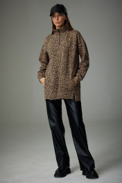 Джемпер покроя спущенное плечо, «оверсайз». Рукав длинный одношовный, по низу с манжетой. Горловина оформлена воротником стойкой. По переду расположена застежка на молнию по воротнику и кокетке. Боковой шов смещен на перед. В шве расположены карманы и разрез. Спинка цельная и длиннее переда на 3 см. По переду и спинке широкая подгибка. Ширина изделия на уровне глубины: 42р – 59см, 44р – 59см, 46р – 59см, 48р – 64см, 50р – 64см, 52р – 64см. Ширина по линии бедер низу: 42р – 57см, 44р – 57см, 46р – 57см, 48р – 63см, 50р – 63см, 52р – 63см. Длина по среднему шву спинки: 42р – 75см, 44р – 75см, 46р – 75см., 48р – 76см, 50р – 76см, 52р – 76см. Ширина плеча: 42р – 22см, 44р – 22см, 46р – 22см, 48р – 23см, 50р – 23см, 52р – 23см. Ширина рукава под проймой: 42р – 21см, 44р – 21см, 46р – 21см, 48р – 23,5см, 50р – 23,5см, 52р – 23,5см. Длина рукава от горловины: 42р – 69см, 44р – 69см, 46р – 69см, 48р – 70см, 50р – 70см, 52р – 70см.