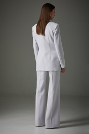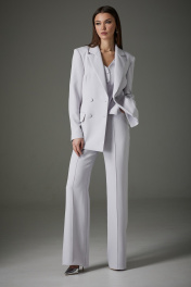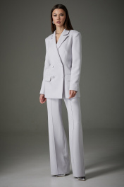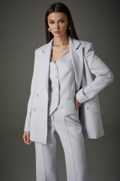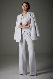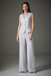 Комплект женский трехпредметный: жакет, жилет, брюки. Жакет: полуприлегающего силуэта, рукав втачной, двухшовный, воротник пиджачного типа. Изделие выполнено из костюмной ткани, на подкладке. Перед имеет смещенную бортовую застежку на две функциональные пуговицы, прорезные карманы в рамку с клапаном. Спинка имеет центральный шов и талевые вытачки. Жилет: полуприлегающего силуэта из костюмной ткани, длиной до уровня бедер. Изделие имеет подкладку только по деталям переда. Перед на центрально-бортовой застежке, оформлен пуговицами в цвет ткани. На уровне талии имитация прорезных карманов в рамку. «V»- образная горловина, фигурный низ изделия. Брюки: расширены к низу от уровня колена. На передней и задней половине отстроченные стрелки. На задней половине расположена кокетка. Жакет: Ширина изделия на уровне глубины: 42р – 46см, 44р – 48см, 46р – 50см, 48р – 52см, 50 – 54см, 52р – 56см. Ширина по линии бедер: 42р -50см, 44р – 52см, 46р – 54см, 48р – 56см, 50 – 58см, 52р – 60см. Длина по среднему шву спинки: 42р - 73см, 44р – 73см, 46р – 73см, 48р – 75см, 50 – 75см, 52р – 75см. Ширина плеча: 42р – 13см, 44р – 13см, 46р – 13см, 48р – 14см, 50 – 14см, 52р – 14см. Ширина рукава под проймой: 42р – 16см, 44р – 17см, 46р – 18см, 48р – 19см, 50 – 19см, 52р – 19см. Длина рукава: 42р-52р -62 см. Брюки: Ширина по линии талии : 42р – 34см, 44р – 36см, 46р – 38см, 48р – 40см, 50 – 42см, 52р – 44см. Ширина по линии бедер: 42р – 47см, 44р – 49см, 46р – 51см, 48р – 52см, 50 – 54см, 52р – 56см. Длина по боковому шву:42р–52р–113см. Ширина брючины внизу: 42р – 23см, 44р – 24см, 46р – 25см. Высота посадки: 42р – 34см, 44р – 34см, 46р – 34см, 48р – 36см, 50 – 36см, 52р – 36см. Длина по внутреннему шву: 42р – 52р – 83см.
