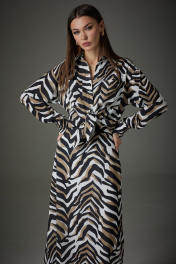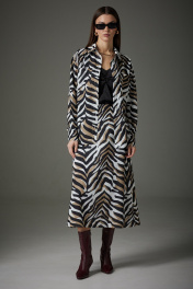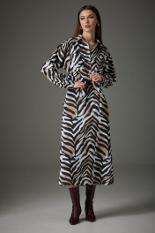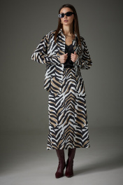 Комплект женский, выполнен из плательно-блузочной ткани. Блуза с центрально-бортовой застежкой на планку. Покрой спущенное плечо, рукав двухшовный с притачной манжетой по низу, застегивающийся на две пуговицы. На спинке расположена встречная складка. Низ блузы закругленной формы. Юбка расширенная к низу, длина до середины икры. Верхний срез обработан обтачкой. Юбка на подкладке. В левом боковом шве вставлена потайная тесьма-молния. Блуза: Ширина изделия на уровне глубины: 42р – 49см, 44р – 51см, 46р – 53см, 48р – 55 см, 50р – 57см, 52р – 59см. Ширина по линии талии: 42р – 45,5см, 44р – 47,5см, 46р – 49,5см, 48р – 51,5см, 50р – 53,5см, 52р – 55,5см. Длина по среднему шву спинки: 42-52р – 68см. Ширина плеча: 42р – 17см, 44р – 18см, 46р – 19см, 48р -21см, 50р – 23см, 52р – 25см. Ширина рукава под проймой: 42р -52р – 22см. Длина рукава:42р -52р – 73см Юбка: Ширина по линии талии: 42р – 34см, 44р – 36см, 46р – 38см, 48р - 40см, 50р – 42см, 52р – 44см. Ширина по линии бедер: 42р – 48см, 44р – 50см, 46р – 52см, 48р - 54см, 50р – 56см, 52р – 58см Длина по боковому шву с бахромой: 42р -52р – 82 см.