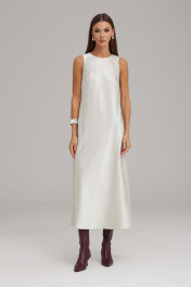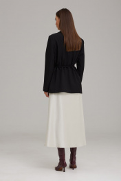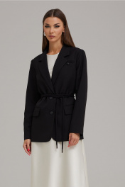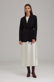 Комплект женский, состоящий из жакета и платья, выполнен из двух видов ткани. Жакет на подкладке, полуприлегающего силуэта, втачного покроя с центрально-бортовой застежкой на петли и пуговицы. Горловина оформлена воротником пиджачного типа. Рукав двухшовный, длинный. По переду расположены рельефы с нагрудной вытачкой, в области бедер – прорезные карманы в рамку с клапаном. В верхней части переда жакета расположен карман в рамку с петелькой (имитация). Борт и клапаны по низу закруглены. Спинка со средним швом и рельефами. Платье с американской проймой, полуприлегающего силуэта. Платье выполнено из атласной струящейся ткани, покроено по косой. Горловина округлой формы, по спинке с застежкой на пуговицу. По переду расположены нагрудные вытачки, на спинке – талиевые вытачки. Платье с трикотажной подкладкой. К комплекту прилагается пояс-шнур. Жакет: Ширина изделия на уровне глубины: 42р – 49см, 44р – 51см, 46р – 53см; Ширина по линии талии: 42р – 48см, 44р – 50см, 46р – 52см; Ширина по линии бедер: 42р – 51см, 44р – 53см, 46р – 55см; Ширина рукава под проймой: 42р – 16см, 44р – 17см, 46р – 18см; Длина по среднему шву спинки: 42-46р – 70см; Ширина спинки: 42-46р – 40см; Ширина плеча: 42-46р – 13см; Длина рукава: 42-46р – 62см. Платье: Ширина изделия на уровне глубины: 42р – 42см, 44р – 44см, 46р – 46см; Ширина по линии талии: 42р – 43см, 44р – 45см, 46р – 47см; Ширина по линии бедер: 42р – 50см, 44р – 52см, 46р – 54см; Длина по среднему шву спинки: 42-46р – 124см; Ширина плеча: 42-46р – 6см.