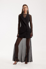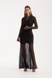 Комплект женский трехпредметный, состоящий из жилета и платья верхнего и платья нижнего. Платье женское, приталенного силуэта «годе», втачного покроя. Платье состоит из двух частей. Верхнее платье выполнено из сетки, а нижнее – из трикотажного полотна. Верхнее платье состоит из центральных частей переда, спинки и боковых частей, а так же рукавов. На спинке верхнего платья расположен средний шов с «молнией». Горловина округлой формы. Рукава одношовные, с дыркой в шве на уровне большого пальца. По переду расположены нагрудные вытачки, идущие из бокового шва. Расклешение «годе» начинается от уровня выше колена. Нижнее платье, приталенного силуэта длины мини на шлейках в 1см. По переду V-образный вырез, по спинке – прямой. Жилет выполнен на подкладке из костюмной ткани, полуприлегающего силуэта, втачного покроя с двубортной застежкой по три пары пуговиц. Горловина оформлена воротником пиджачного типа. Жилет удлиненный, в области бедер расположены прорезные карманы в рамку с петелькой и пуговицей. Спинка состоит из центральных и боковых частей. По переду расположены бочки и нагрудные вытачки. Платье верхнее: Ширина изделия на уровне глубины: 42р – 42см, 44р – 44см, 46р – 46см; Ширина по линии талии: 42р – 34см, 44р – 36см, 46р – 38см; Ширина по линии бедер: 42р – 46см, 44р – 48см, 46р – 50см; Ширина рукава под проймой: 42р – 13см, 44р – 14см, 46р – 15см; Длина по среднему шву спинки: 42-46р – 144см; Ширина спинки: 42-46р – 37см; Ширина плеча: 42-46р – 10см; Длина рукава: 42-46р – 72см. Платье нижнее: Ширина изделия на уровне глубины: 42р – 39см, 44р – 41см, 46р – 43см; Ширина по линии талии: 42р – 35,5см, 44р – 37,5см, 46р – 39,5см; Ширина по линии бедер: 42р – 46см, 44р – 48см, 46р – 50см; Длина по среднему шву спинки: 42р – 63см, 44р – 63см, 46р – 63см. Жилет: Ширина изделия на уровне глубины: 42р – 44см, 44р – 46см, 46р – 48см; Ширина по линии талии: 42р – 39см, 44р – 41см, 46р – 43см; Ширина по линии бедер: 42р – 48см, 44р – 50см, 46р – 52см; Длина по среднему шву спинки: 42-46р – 79см; Ширина плеча: 42-46р – 6,5см.