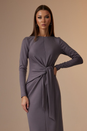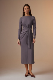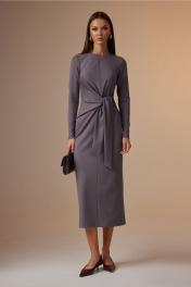 Платье женское, полуприлегающего силуэта. Перед со средним швом и драпировкой в области талии, переходящей в завязывающийся пояс. Горловина округлой формы. Спинка со средним швом, сверху заканчивается разрезом и застежкой на навесную петлю и пуговицу, снизу разрез. Рукав втачной, длинный, зауженный книзу. Ширина изделия на уровне глубины: 42р – 42см, 44р – 44см, 46р – 46см, 48р – 48см, 50р – 50см, 52р – 52см; Ширина по линии бедер: 42р – 46см, 44р – 48см, 46р – 50см, 48р – 52см, 50р – 54см, 52р – 56см; Длина по среднему шву спинки: 122см; Ширина спинки: 42-46р – 32см, 48-52р – 34см; Ширина плеча: 42-46р – 8,5см, 48-52р – 10см. Ширина рукава под проймой: 42р – 16см, 44р – 17см, 46р – 18см, 48р – 19см, 50р – 20см, 52р – 21см; Длина рукава: 62см.