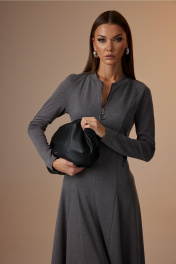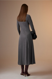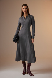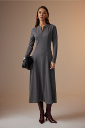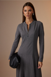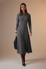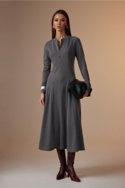 Платье женское полуприлегающего силуэта, с рукавом покроя «реглан». По центру переда – шов, сверху в который вставлена отделочная молния. Так же по переду рельефы, проходящие через центр груди, в них вставлены широкие клинья, создающие драпировку по низу. По горловине пришита бейка из основной ткани. Спинка с двумя рельефами, в которые так же вставлены клинья. Рукав покроя «реглан», длинный, зауженный к низу. Ширина изделия на уровне глубины: 42р – 43см, 44р – 45см, 46р – 47см, 48р – 49см, 50р – 51см, 52р – 53см; Ширина по линии талии: 42р – 37см, 44р – 39см, 46р – 41см, 48р – 43см, 50р – 45см, 52р – 47см; Ширина по линии бедер: 42р – 48см, 44р – 50см, 46р – 52см, 48р – 54см, 50р – 56см, 52р – 58см; Ширина рукава под проймой: 42р – 16см, 44р – 17см, 46р – 18см, 48р – 19см, 50р – 20см, 52р – 21см; Ширина спинки: 42-46р – 34см 48р – 36см, 50р – 38см, 52р – 40см; Длина рукава от горловины: 42-52р – 72см; Длина по среднему шву спинки: 42-52р – 123см.