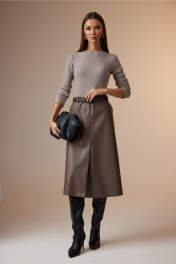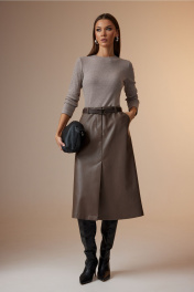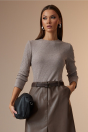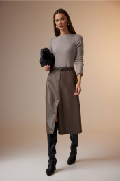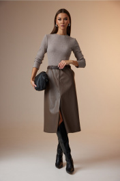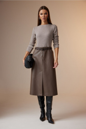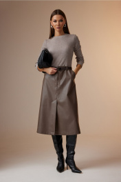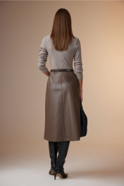 Платье женское полуприлегающего силуэта, выполнено из двух видов ткани: верх из трикотажного полотна виде джемпере, низ виде расширенной юбки из кожзаменителя. Джемпер с круглой горловиной, с втачными длинными рукавами и молнией по центру спинки. Юбка со средним швом на передней половинке, в котором шлица снизу и наклонные карманы. На заднем полотнище средний шов, в котором заканчивается молния и талиевые вытачки. На переднем и заднем полотнище пришиты шлевки. ВНИМАНИЕ! Ремень не входит в комплектацию! Ширина изделия на уровне глубины: 42р – 40см, 44р – 42см, 46р – 44см, 48р – 46см, 50р – 48см, 52р – 50см; Ширина по линии талии: 42р – 34см, 44р – 36см, 46р – 38см, 48р – 40см, 50р – 42см, 52р – 44см; Ширина по линии бедер: 42р – 47см, 44р – 49см, 46р – 51см, 48р – 53см, 50р – 55см, 52р – 57см; Ширина рукава под проймой: 42р – 15см, 44р – 16см, 46р – 17см, 48р – 18см, 50р – 19см, 52р – 20см; Ширина плеча: 42-46р – 10,5см, 48-52р – 12см; Ширина спинки: 42-46р – 31см, 48-52р – 33см; Длина рукава: 60см; Длина по среднему шву спинки: 113см.